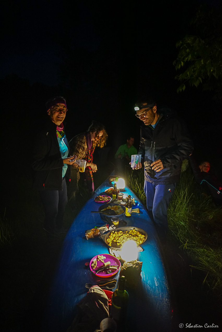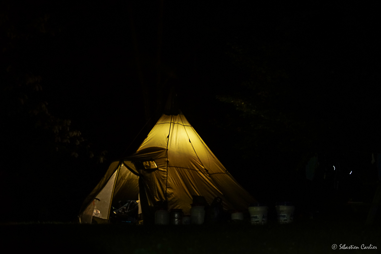 Montage tous ensemble du bivouac, avec différents types d’abris, de tentes, hamac, tarp, .... Repas partagé avec une attention portée aux pistes de menus, mais aussi des techniques de cuissons, la gestion des besoins fondamentaux (Hygiène – cuisine - …).