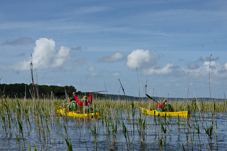 Plaisir de la glisse, ... passage dans les roselières, .... seule l’onde de la pagaie dans l’eau vient troubler le miroir d’eau, ...