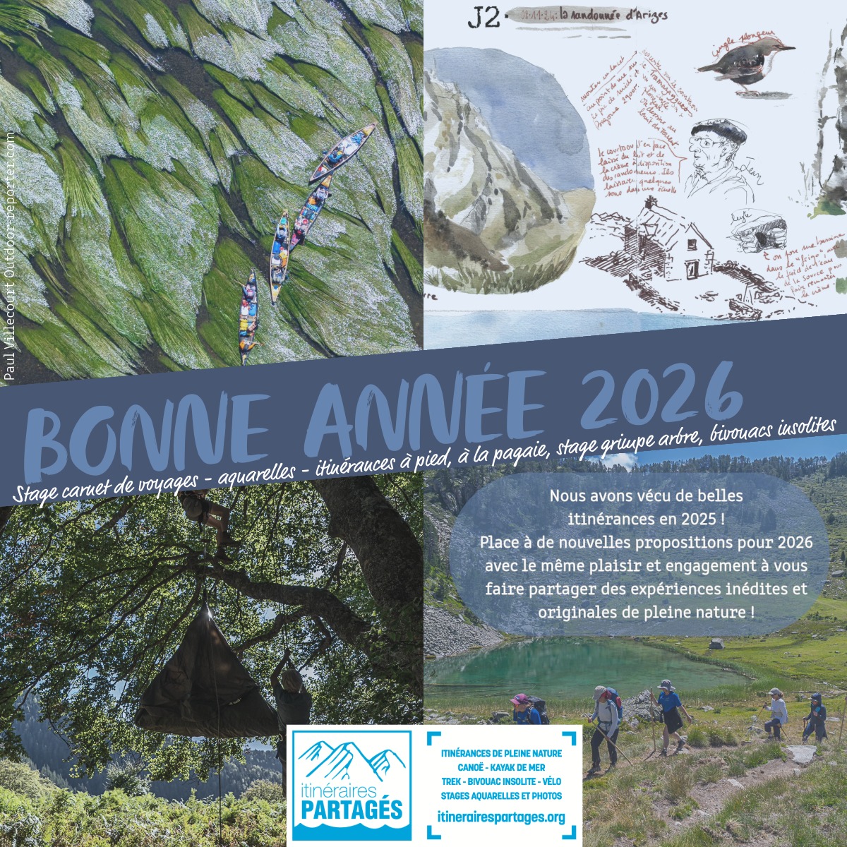 - à proposer des sessions, sorties, itinérances inédites, créés, organisés et encadrés par un collectif de professionnels du plein air : guides de rivières, guides de kayak de mer, accompagnateurs montagne, grimpeur d’arbres, ..