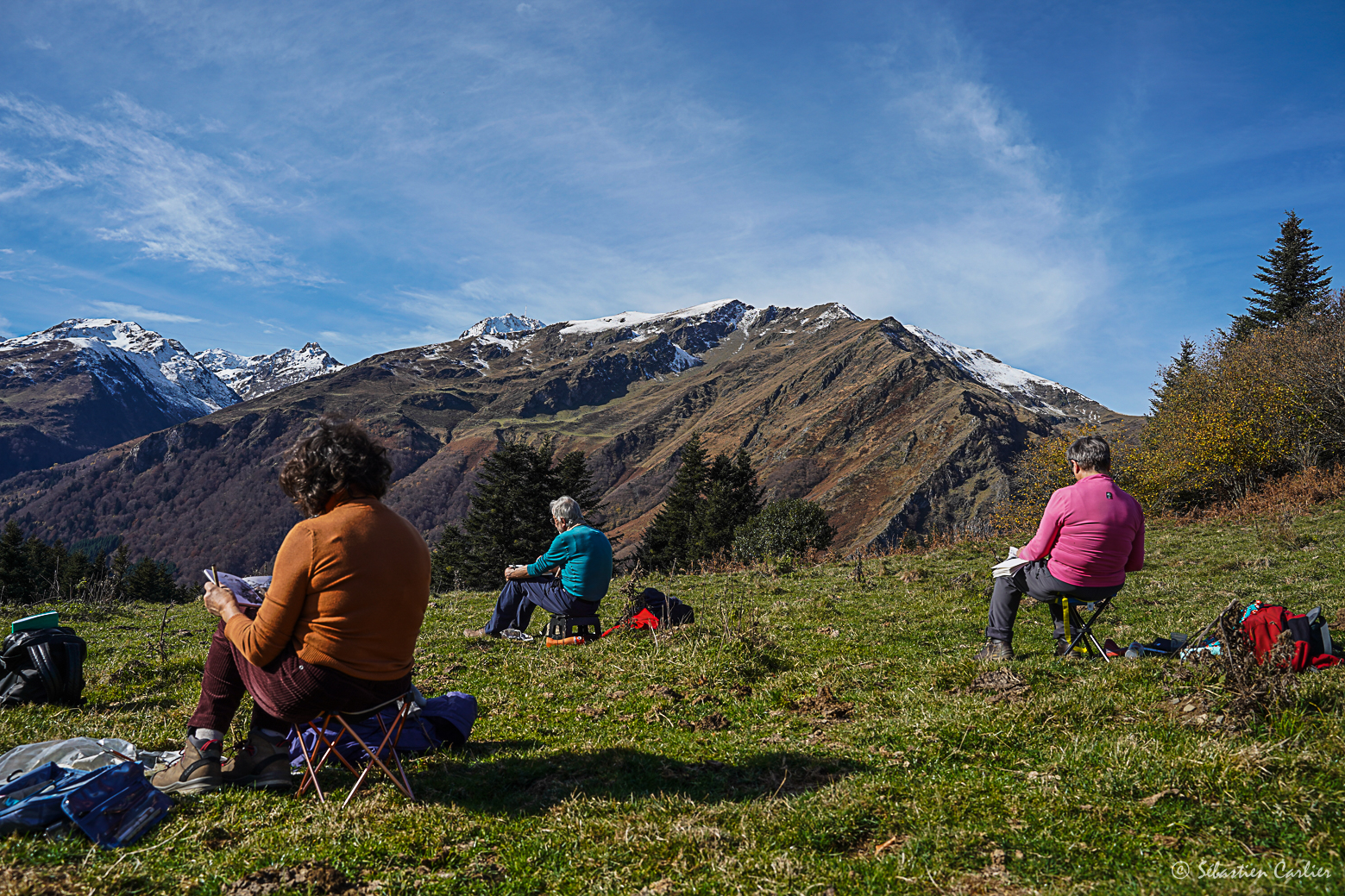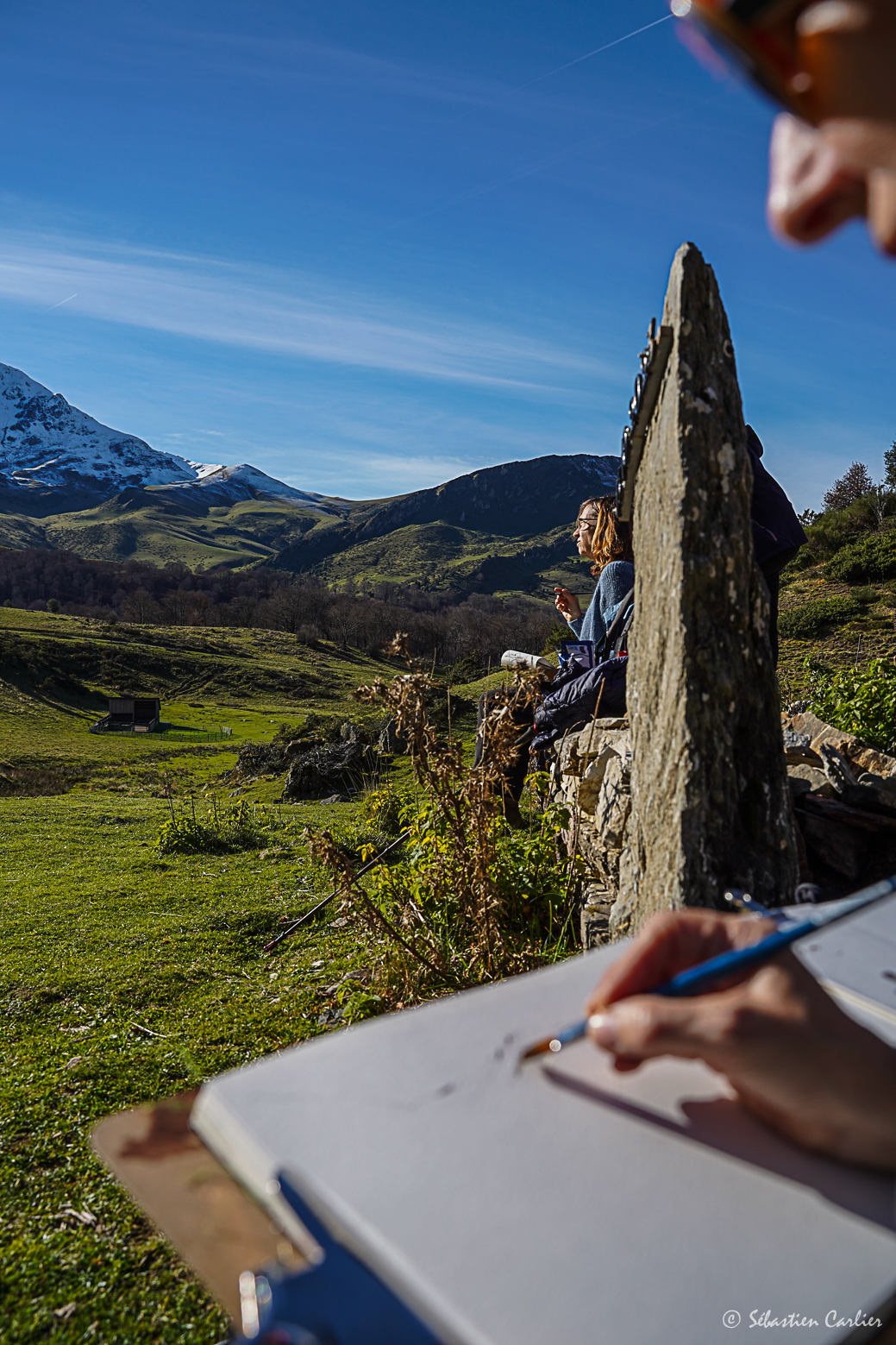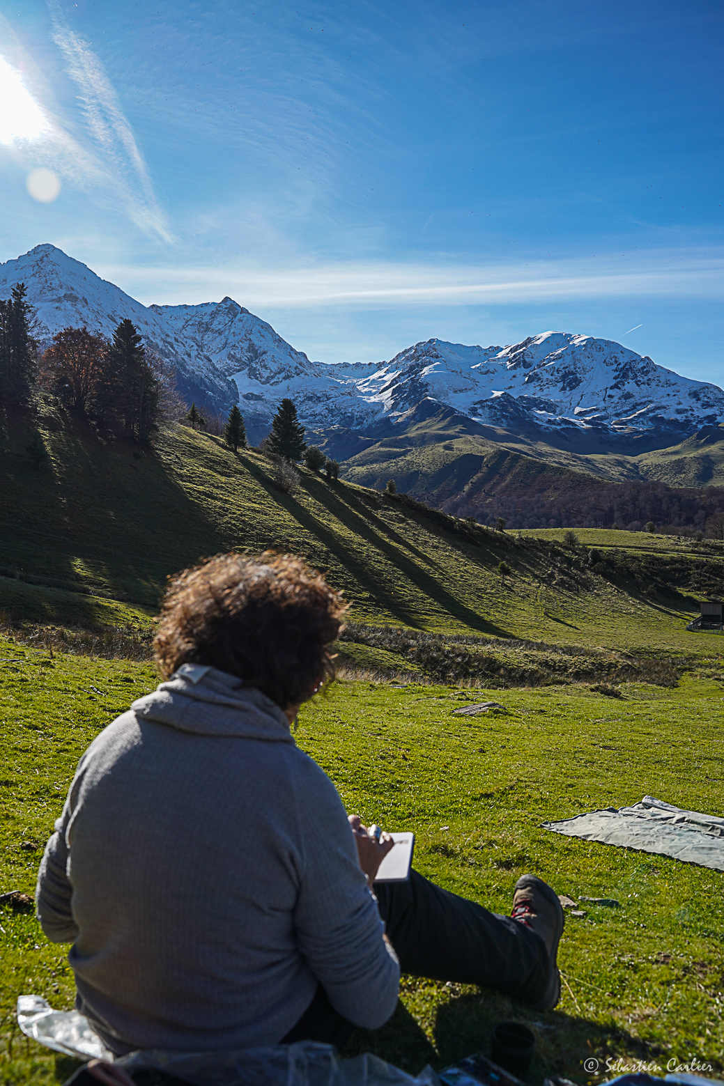 Nous avons passé 4 jours dans la Vallée de Campan à croquer et peindre montagnes, arbres, couleurs d’automne, ciels. Les carnets se sont remplis de mille histoires rencontrées en chemin ou contées par Sébastien.